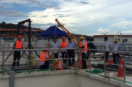 “深洞”中實(shí)施維修。經(jīng)過長(zhǎng)達(dá)近8個(gè)小時(shí)堅(jiān)持不懈的帶水搶修作業(yè),維修人員終于在池底找到另一半斷裂的葉輪,并成功將攪拌機(jī)葉輪拆卸下來。剩下的工作,則更需要潼湖水廠和衷共濟(jì)、攻堅(jiān)克難,把斷裂的攪拌機(jī)葉輪焊接回原處。在高溫炙烤的悶熱天氣下,維修人員不負(fù)眾望、排除萬難,順利完成維修任務(wù),2組高效反應(yīng)池得以及時(shí)恢復(fù)正常使用。