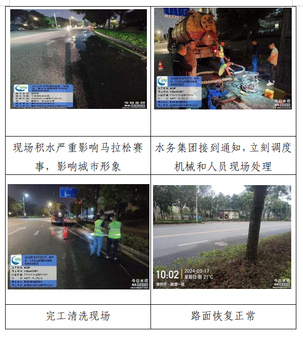接到通知后,集團(tuán)領(lǐng)導(dǎo)高度重視,立即組織相關(guān)負(fù)責(zé)人趕往現(xiàn)場(chǎng),會(huì)同市市政園林事務(wù)中心共同開展處置工作,現(xiàn)場(chǎng)初步勘查發(fā)現(xiàn)沿線三個(gè)污水井無法開啟,滿管污水正不斷往路面溢流??紤]到“惠馬”賽事開跑在即,為保障“惠馬”比賽順利進(jìn)行,在時(shí)間異常緊迫的情況下,集團(tuán)要求市排水管理中心立即調(diào)度人員和市政排水工具車、高壓沖水車、吸污車等機(jī)械車輛,對(duì)涌水路段進(jìn)行緊急高壓水槍沖打、封堵氣囊、抽排吸污,并在吸污完成后清洗了路面。次日,集團(tuán)派員實(shí)時(shí)關(guān)注路面情況,經(jīng)緊急處理后的路面情況正常,路面整潔干燥,無污水溢流等情況,馬拉松比賽未受影響。