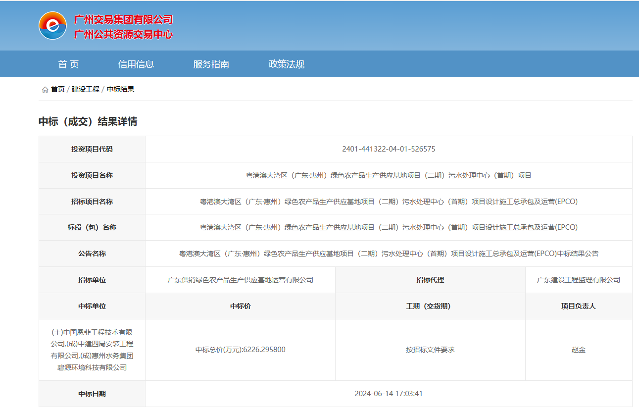 6月4日,碧源公司作為運營單位,與中國恩菲工程技術(shù)有限公司(設(shè)計單位)及中建四局安裝工程有限公司(施工單位)組成聯(lián)合體,成功中標(biāo)粵港澳大灣區(qū)(廣東·惠州)綠色農(nóng)產(chǎn)品生產(chǎn)供應(yīng)基地項目(二期)污水處理中心(首期)項目設(shè)計施工總承包及運營(EPCO),標(biāo)志著公司正式踏入博羅縣污水處理市場,填補了公司業(yè)務(wù)在全市水務(wù)環(huán)保領(lǐng)域的最后一塊拼圖。